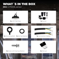 La LED High Bay est livrée avec un anneau de suspension. Elle est équipée d’un câble de raccordement de 30 cm (H05RN-F 3x1,0 mm²). Pour une installation sûre, il est recommandé d’utiliser un connecteur IP68. Celui-ci permet un raccordement rapide, tout en assurant une étanchéité à la poussière et à l’eau.
