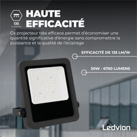 Le projecteur LED de 50W est certifié IP65. Cela signifie qu'il est étanche à la poussière et aux jets d'eau. Il est donc adapté pour une utilisation intérieure et extérieure. Avec un rendement de 135 lumens par watt, ce projecteur LED asymétrique Lumileds est également très efficace. Le facteur de puissance de ce projecteur LED économe en énergie est de 0,95. Cela rend le projecteur extrêmement adapté pour des projets de grande envergure comme les parkings. La couleur de la lumière émise par ce projecteur LED est une lumière naturelle (4000K).