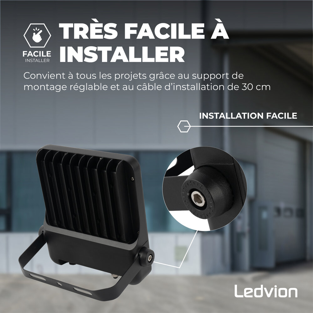 Ce projecteur LED professionnel de 50W remplace l'actuel projecteur de 450 watts. Le projecteur LED extérieur dispose d'un verre de sécurité trempé IK08, ce qui le rend idéal pour un usage professionnel. La surface en aluminium du projecteur LED protège contre la corrosion. Il fonctionne également sans problème à des températures extrêmes de -20 degrés à 50 degrés.