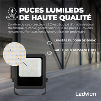 Cette LED professionnelle de 50W remplace le projecteur actuel de 450 Watts. Le projecteur LED extérieur dispose d'un verre de sécurité trempé IK08, ce qui le rend idéal pour les travaux professionnels. La surface en aluminium du projecteur LED le protège contre la corrosion. Il fonctionne également sans problème à des températures extrêmes de -20 degrés à 50 degrés.